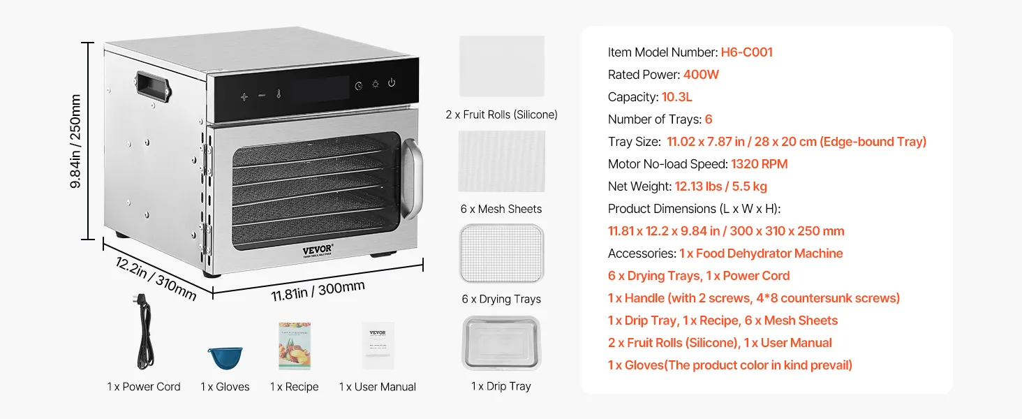 Edge-bound Trays: The beef jerky dehydrator machine comes with six 304 stainless steel trays (11.02 x 7.87 in / 28 x 20 cm) for direct contact with food with peace of mind. The upgraded curved edge-bound design is smooth, preventing injury to hands, easy to clean, and can support heavy loads