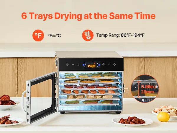6-Layer Large Capacity: This large dehydrator can hold up to six layers of food at once, drying large amounts of ingredients in one go. Control with a smart digital display, adjustable from 86℉ to 194℉ / 30℃ to 90℃, and a 24-hour intelligent timer means no need for manual supervision. Perfect for dehydrating various fruits, vegetables, jerky, herbs, teas, and seafood