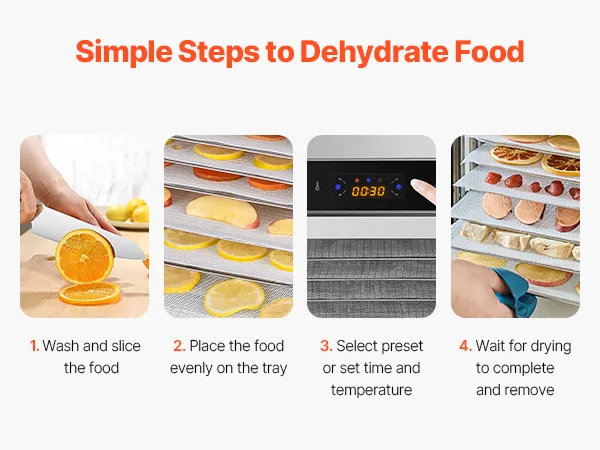 The food dehydration and drying process is very easy. It's recommended to choose fruits and vegetables with rich flesh, and carefully select the best ingredients before drying, removing any spoiled, overripe, or unripe ones.