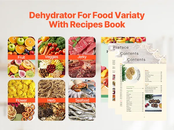 With a 6-layer capacity, the large dehydrator machine is perfect for dehydrating various ingredients, including fruits, vegetables, jerky, herbs, seafood, grains, and more. It also comes with a recipe, enabling you to make various healthy, homemade dried food easily.