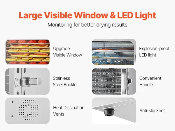 Visible Window: Equipped with a large visible window and built-in explosion-proof LED light, the drying progress of your food is clearly visible. The strong core bearing motor ensures the fan runs smoothly and quietly, operating without disturbing your family