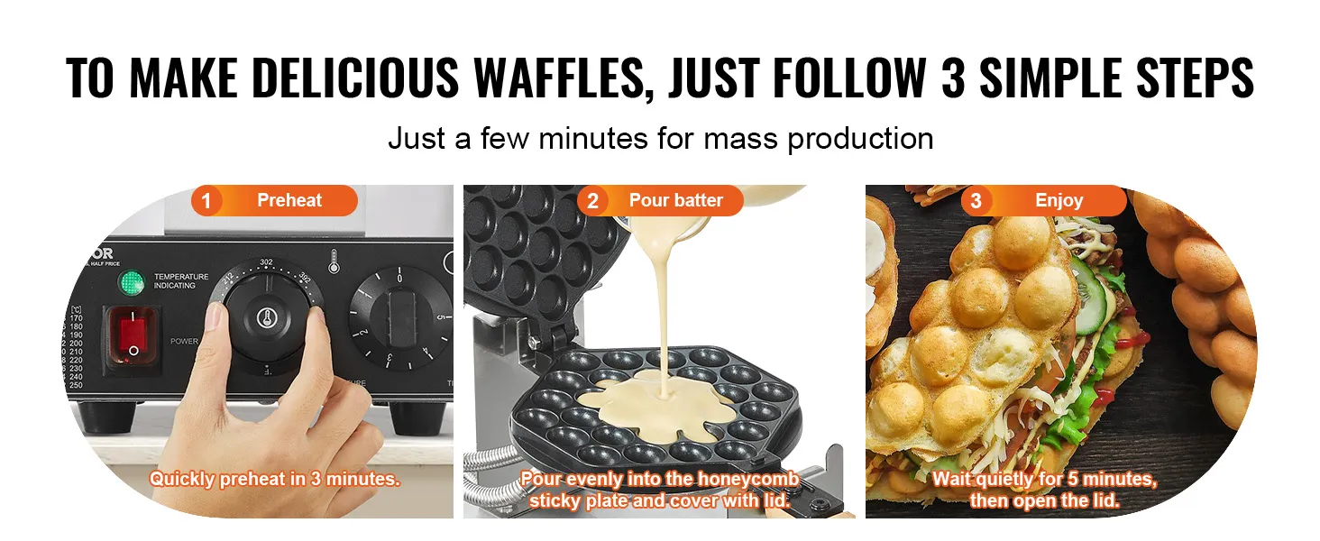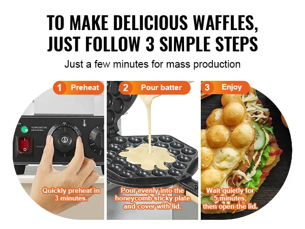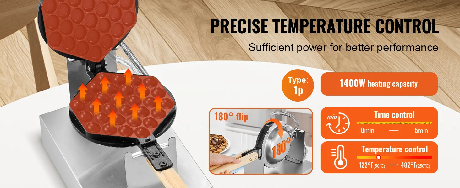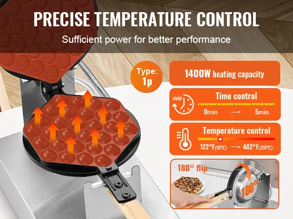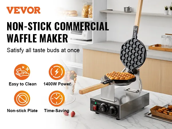 Het 1400W-element in de VEVOR Bubble Egg Waffle Maker warmt snel op en bakt de wafels gelijkmatig. Het duurt slechts een paar minuten om de juiste temperatuur te bereiken, dus je kunt direct beginnen met bakken. De warmte verspreidt zich gelijkmatig over de platen, zodat elke wafel van rand tot midden gelijkmatig gaart.