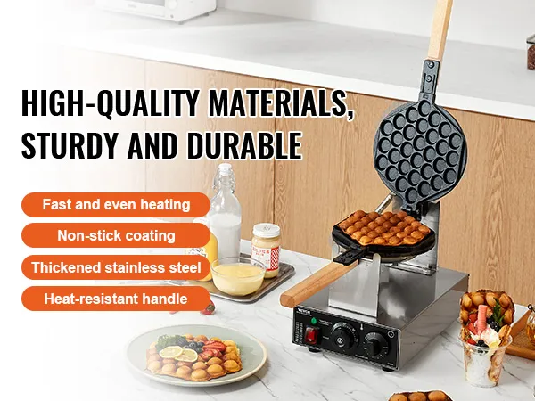 De VEVOR Bubble Egg Wafelijzer is gemaakt van duurzaam roestvrij staal dat bestand is tegen dagelijks gebruik zonder zijn vorm of glans te verliezen. De metalen behuizing voelt solide aan en geeft het apparaat een strakke, moderne uitstraling die perfect past in zowel thuiskeukens als restaurants. De gladde afwerking is gemakkelijk schoon te maken, zodat je je werkplek netjes houdt.