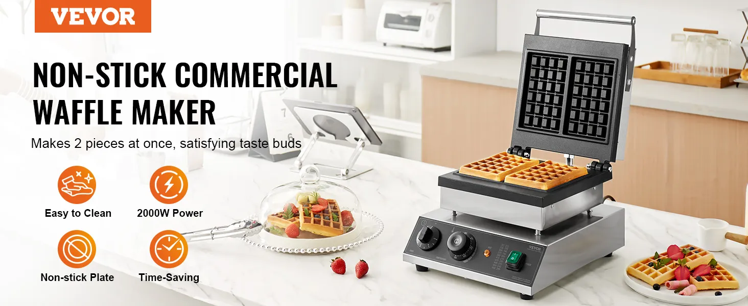 VEVOR Commercial Waffle Maker, 2PCS Rectangle Waffle Baker Machine, 2000W Non-Stick Stainless Steel Belgian Waffle Iron with Temp and Time Control, Handle, for Restaurant Bakery Snack Bar Family