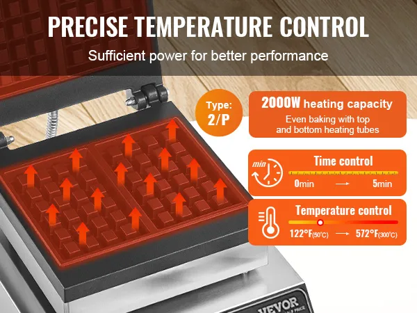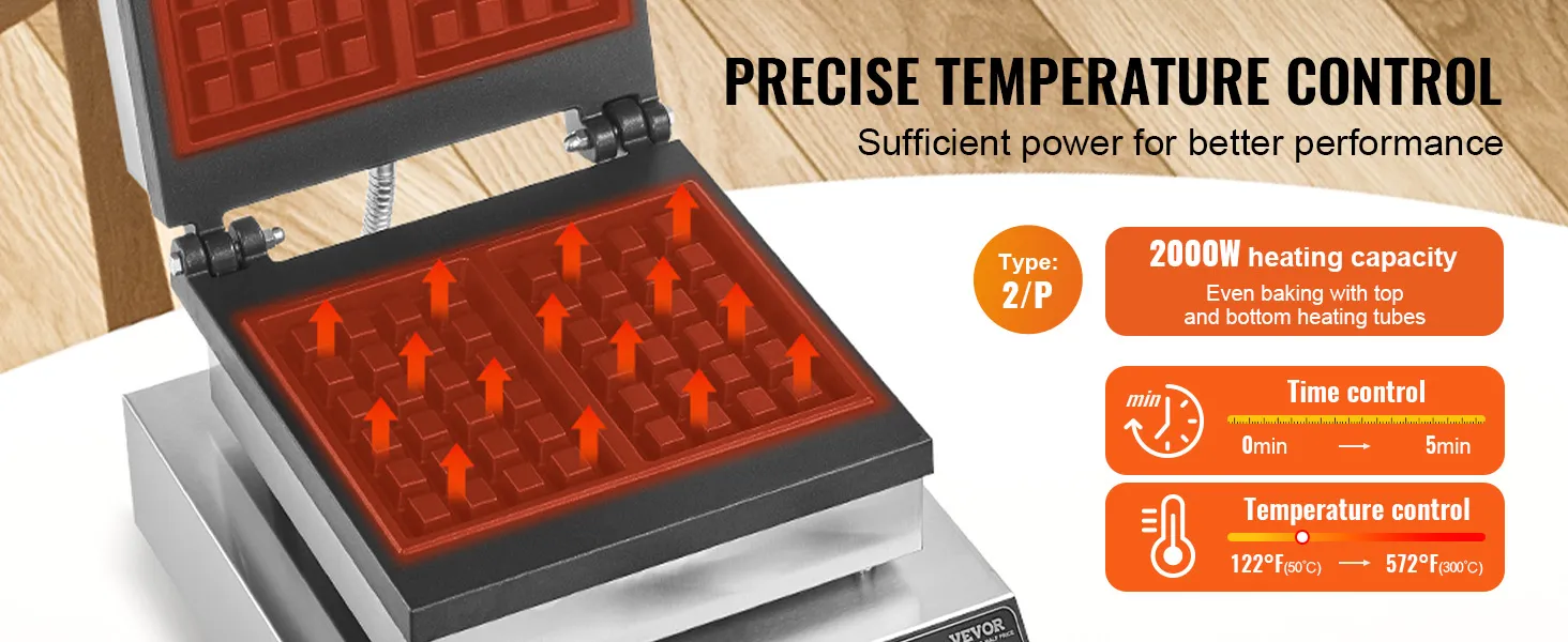 Precision Temperature Control: This commercial waffle maker is designed with a temperature control knob (122-572°F / 50-300°C), allowing you to adjust according to your preferences. Customize it to create personalized waffles, whether you prefer them crispy or fluffy. With individual preparation and audible alerts, it's easy to operate—it reminds you to add batter and indicates when the waffle is cooked, so you don't have to watch it constantly.