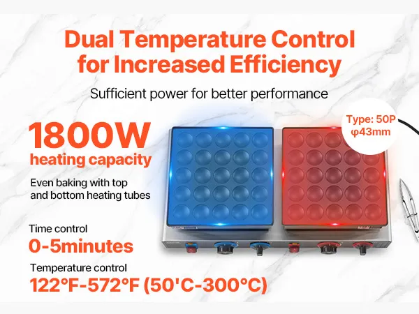 Dubbele temperatuurregeling: Met onafhankelijke bedieningspanelen aan beide kanten, zodat u de baksnelheid in twee bereiken kunt instellen. Met de temperatuurregelaars (50-300 °C) kunt u uw wafels naar wens aanpassen, of u ze nu knapperig of luchtig wilt. Dankzij de aangepaste bak- en geluidssignalen wordt u eraan herinnerd beslag toe te voegen en wordt aangegeven wanneer de wafel klaar is.
