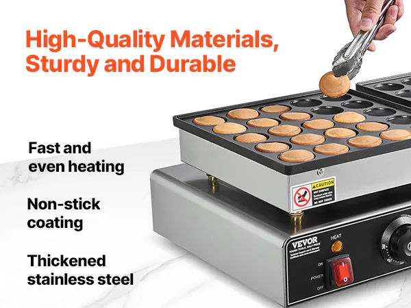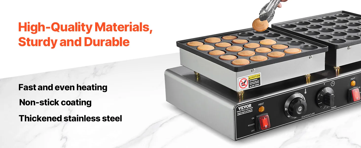 Bereid heerlijke pannenkoeken in een handomdraai: onze krachtige pannenkoekenmaker van 1800 watt bakt zelfstandig 50 heerlijke miniwafels (ca. 43 mm in diameter) tegelijk, knapperig vanbuiten en luchtig vanbinnen. Dit bespaart tijd en zorgt voor een moeiteloos ontbijt. Gelijkmatig verdeelde verwarmingselementen zorgen ervoor dat uw wafels gelijkmatig garen. Verheug u op heerlijke wafels met uw favoriete toppings.