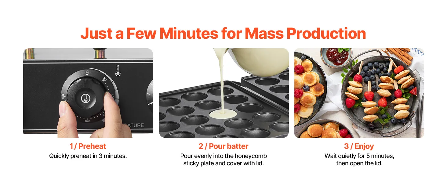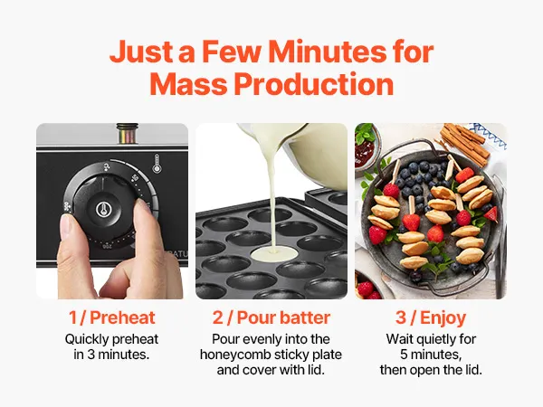 Uitgerust met een nauwkeurige timer en duidelijk gemarkeerde temperatuurregeling, geeft hij een duidelijk piepsignaal zodra de wafel klaar is. De Dorayaki-maker maakt gebruik van gesloten verwarmingscircuittechnologie voor gelijkmatige verwarming, snelle vorming en eenvoudige bereiding van heerlijke pannenkoeken.