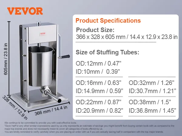 VEVOR Manual Sausage Stuffer, 10 L / 22 LBS Vertical Sausage Machine, Dual-Speed Meat Stuffer, Made of Food-Grade 304 Stainless Steel, Includes 5 Stuffing Tubes, for Home Kitchen Restaurant Commercial