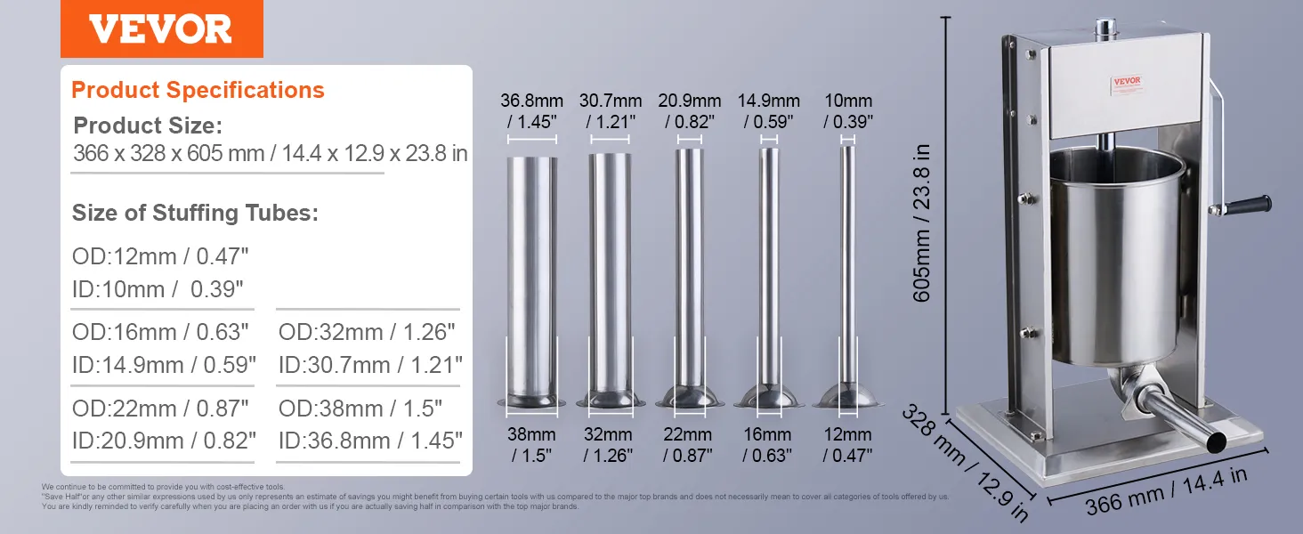 Multiple Types of Accessories: Equipped with 5 different sizes of sausage tubes and accessories for making sausages, hot dogs, churros, etc. Suitable for both commercial and home use.