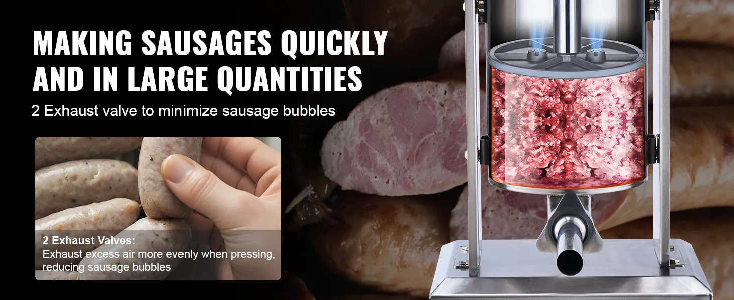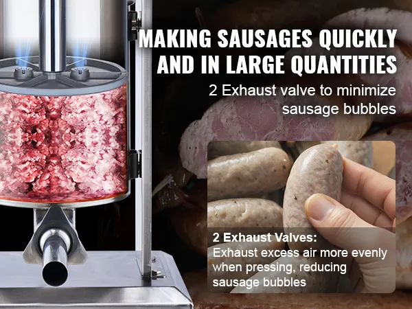 2-speed adjustment allows for freely adjusting the speed based on sausage conditions, ensuring optimal sausage texture. The 2 exhaust valves design expels excess air, reducing sausage bubbles.