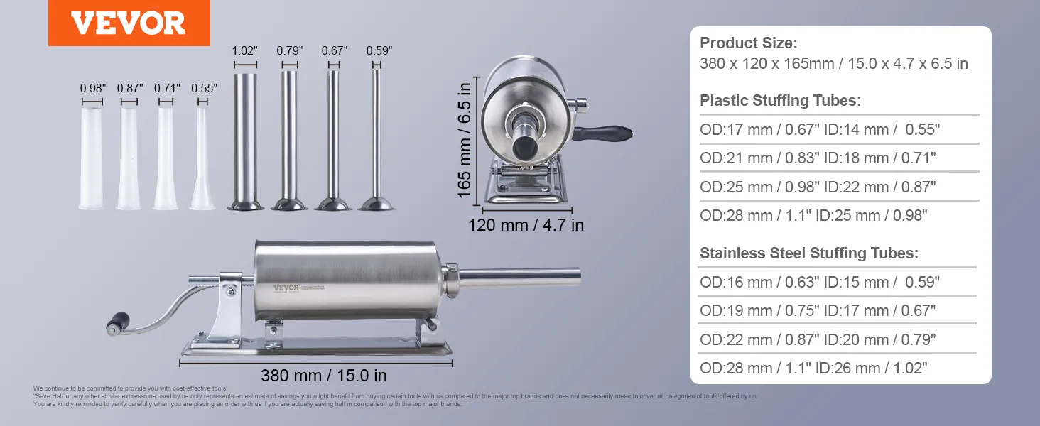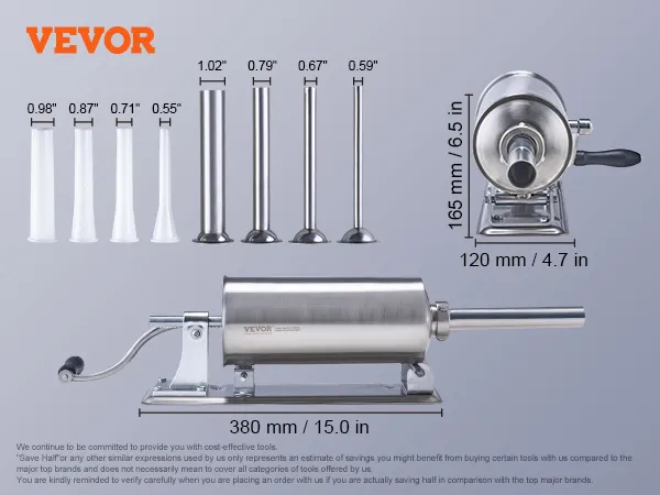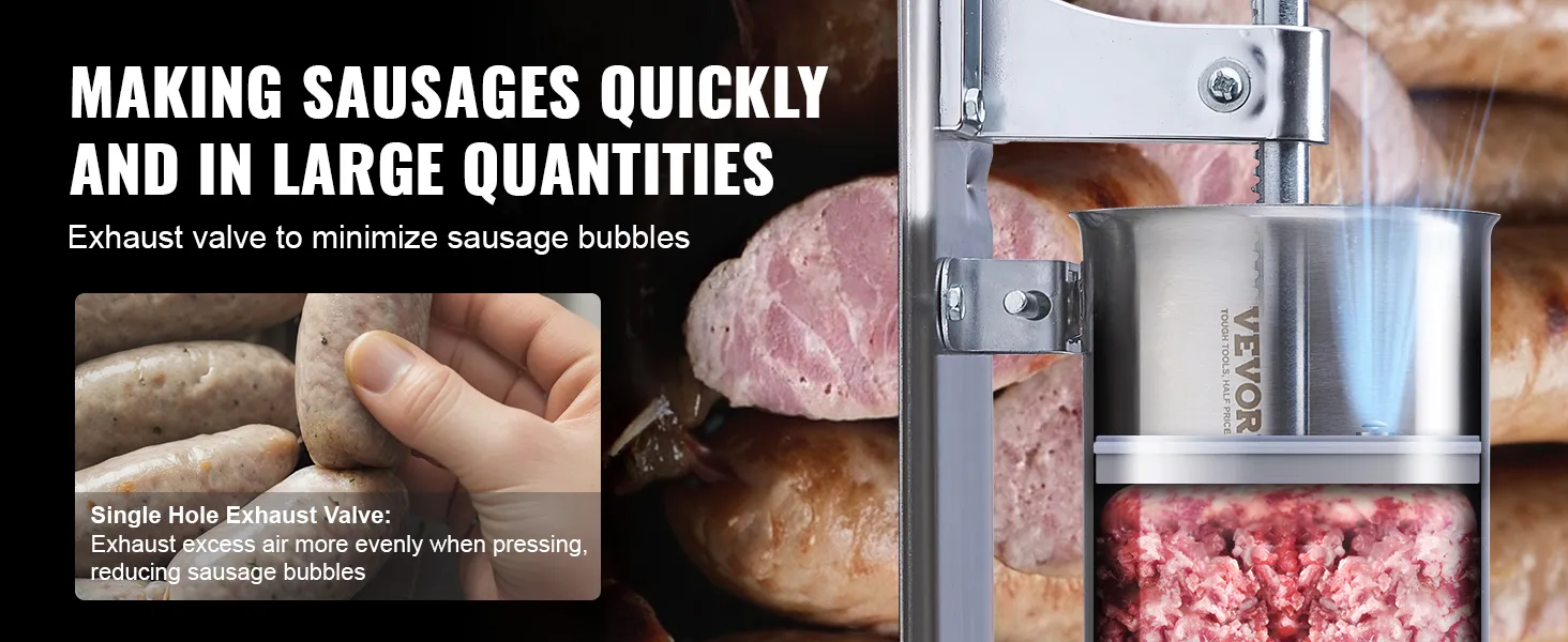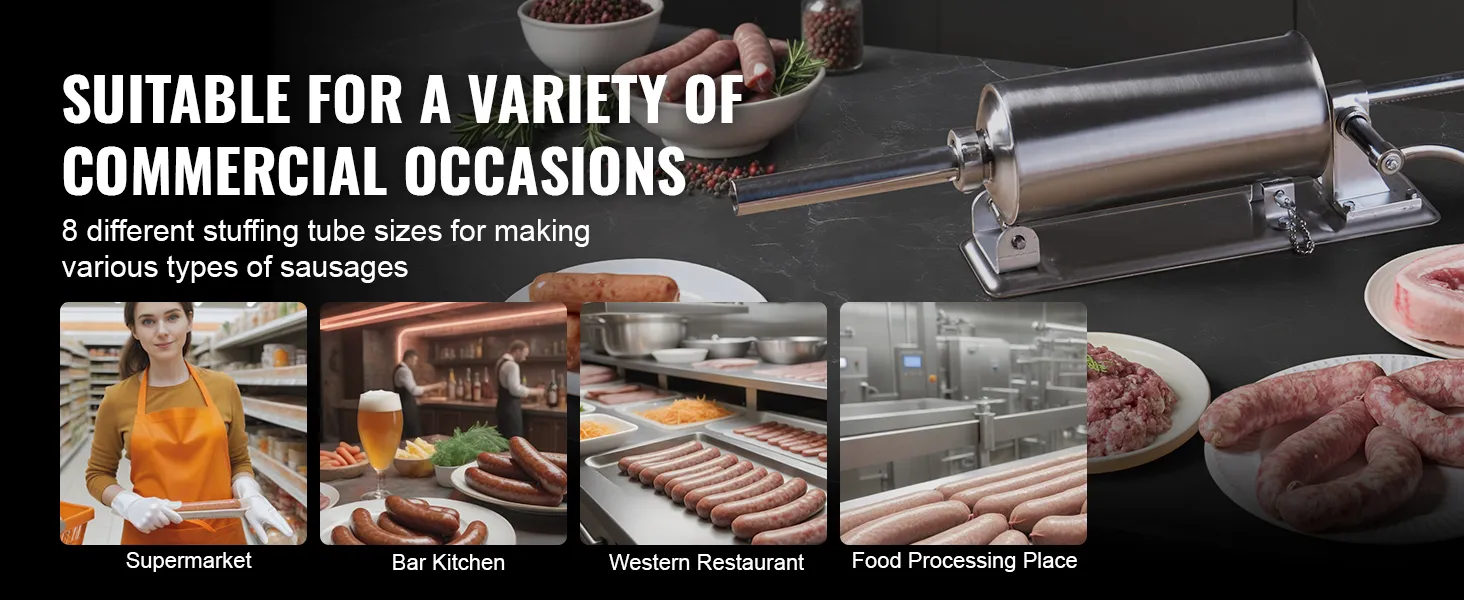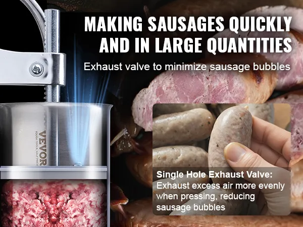 The VEVOR sausage stuffer allows you to simply add meat filling, press, and turn the handle to produce sausages. Made from food-grade stainless steel, comes with 2 materials and 8 different sizes of stuffing tubes, suitable for making various types of sausages, ideal for home and commercial use.