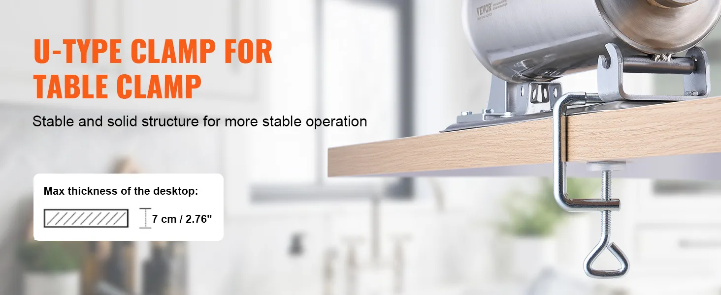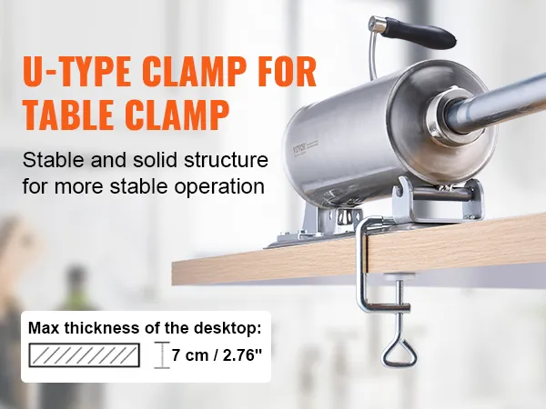 Stable Structure: Table-clamp manual sausage stuffer equipped with 2 U-shaped fixed steel clamps securely grips onto tables, stabilizing the machine during sausage stuffing to prevent it from slipping off the dining table during elevated platform operations.