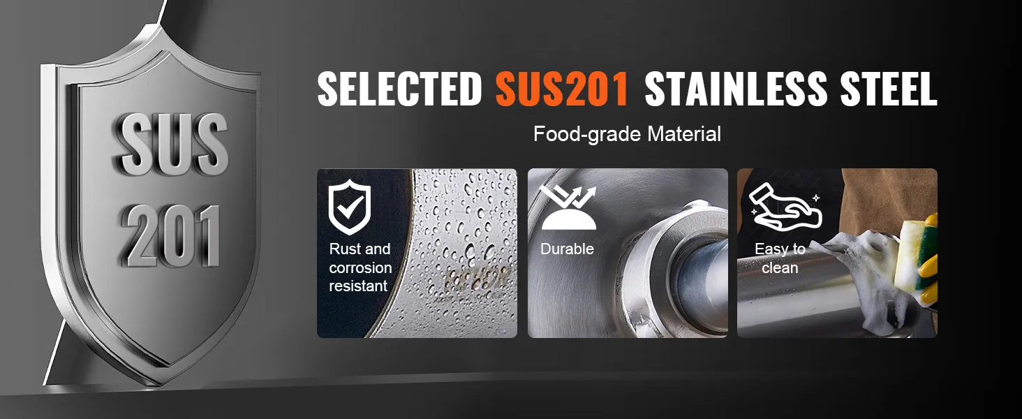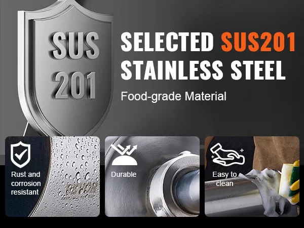 Made from sturdy stainless steel, it is corrosion-resistant and durable. All components that come into contact with food are made from food-grade materials, ensuring health and durability.