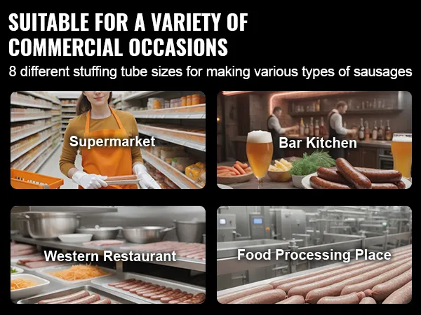Includes 8 different diameter sausage tubes for making sausages of various sizes, suitable for use in kitchens, bars, and restaurants.