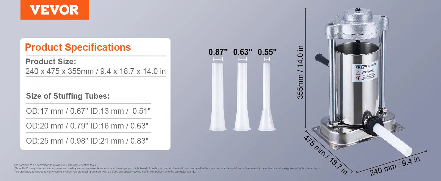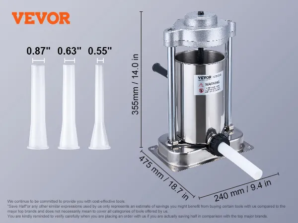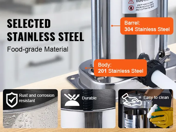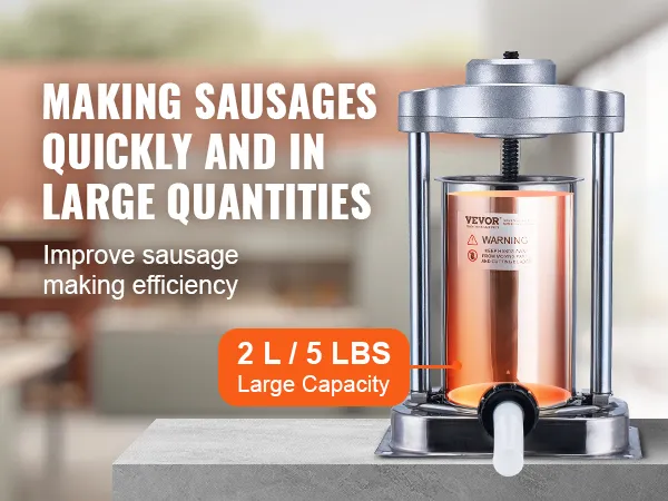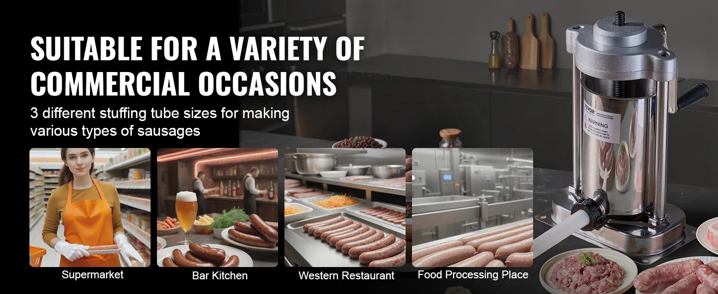 The VEVOR sausage stuffer allows you to simply add meat filling, press, and turn the handle to produce sausages. Made from food-grade stainless steel, comes with 3 different sizes of stuffing tubes, suitable for making various types of sausages, ideal for both home and commercial use.