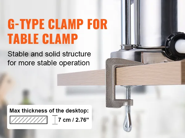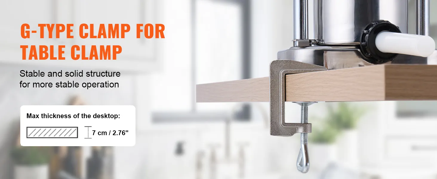 Stable Structure: Table-clamp manual sausage stuffer with 2 G-shaped clamps securely grips onto tables, keeping the machine stable during sausage stuffing, preventing it from slipping off the table during elevated platform operations.