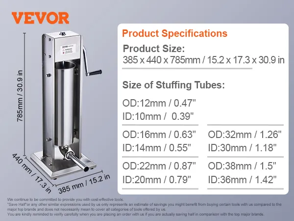 VEVOR Manual Sausage Stuffer, 7 L / 15 LBS Vertical Sausage Machine, Dual-Speed Meat Stuffer, Made of Food-Grade 304 Stainless Steel, Includes 5 Stuffing Tubes, for Home Kitchen Restaurant Commercial