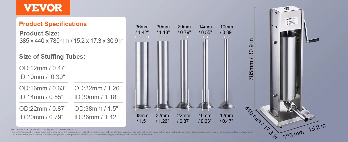 Multiple Types of Accessories: Equipped with 5 different sizes of sausage tubes and accessories for making sausages, hot dogs, churros, etc. Suitable for both commercial and home use.
