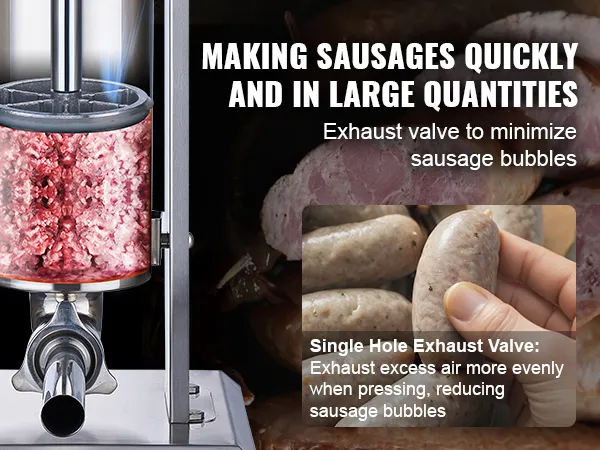 2-speed adjustment allows for freely adjusting the speed based on sausage conditions, ensuring optimal sausage texture. The single-hole exhaust valve design expels excess air, reducing sausage bubbles.