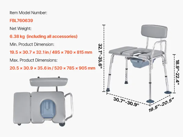 Hoogteverstelbaar: Deze toiletstoel is voorzien van 8 niveaus hoogteverstelling via C-klemmen, met een zithoogtebereik van 480 tot 570 mm (18,9 tot 22,4 inch). Pas hem eenvoudig aan uw comfort aan - ideaal voor het overstappen van de bank of het aanpassen aan verschillende toilethoogtes.