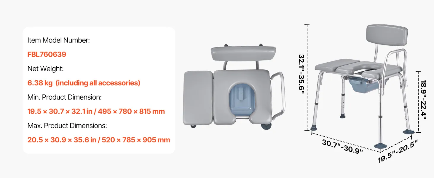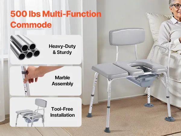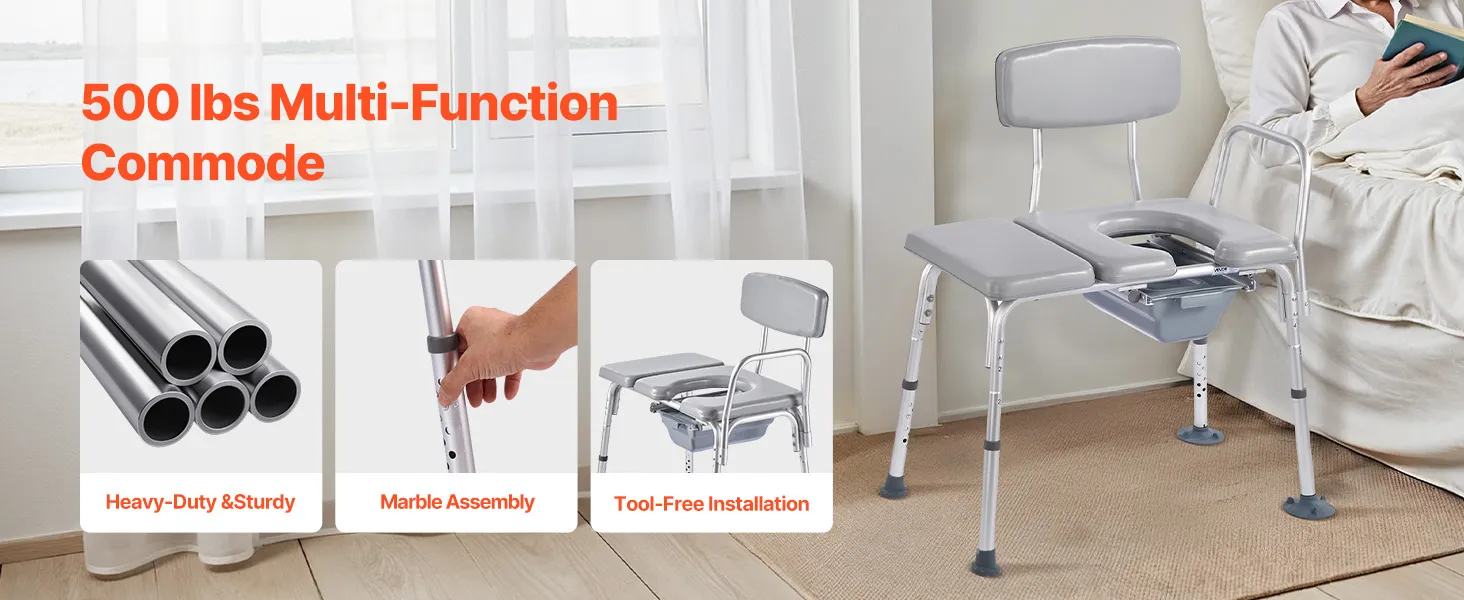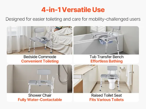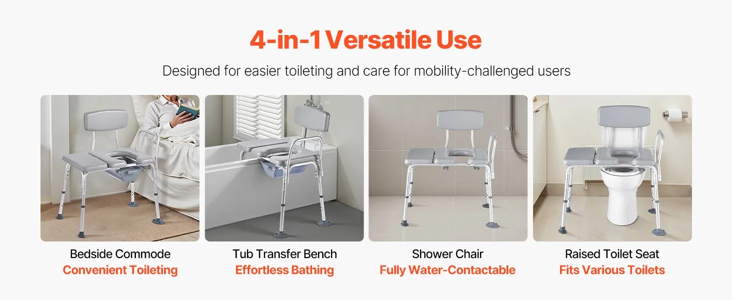 4-in-1 toiletstoel: Deze stoel combineert een nachtkastje en een bad-transferbankje in één. Met zijn versterkte aluminium frame is hij bestand tegen een gewicht tot 227 kg. Gebruik hem als nachtkastje, bad-transferbankje, verhoogde toiletzitting of douchestoel.