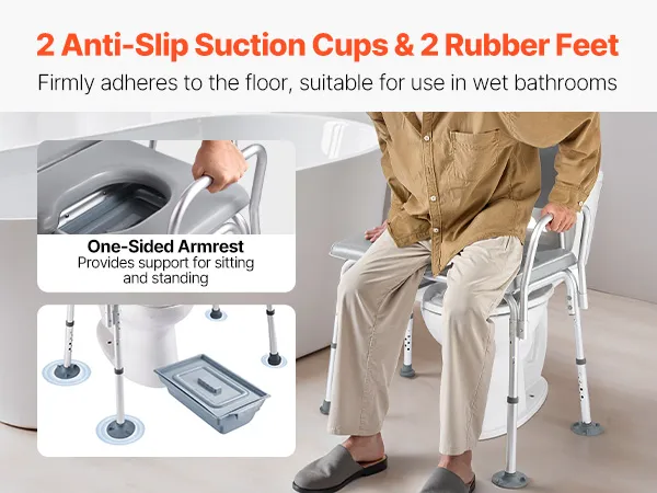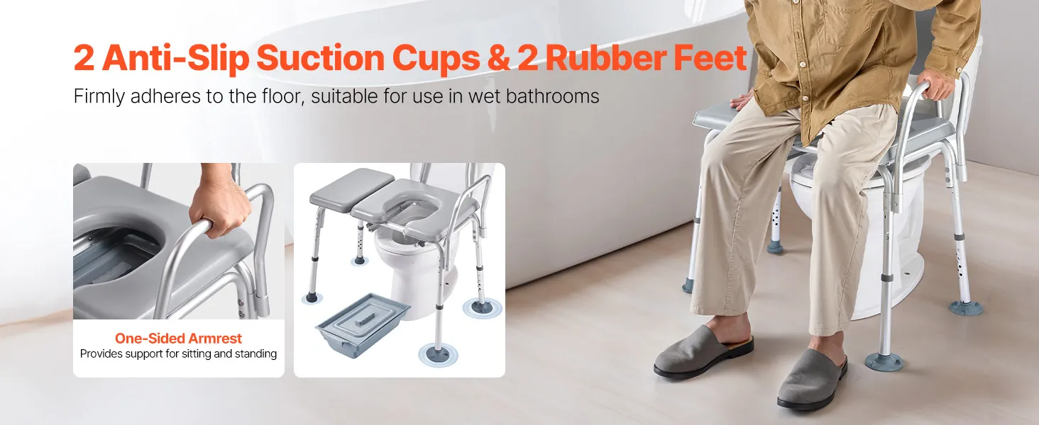 De commode is voorzien van twee grote zuignapvoetjes en twee rubberen pads voor een stevige ondersteuning. Dit verhoogt de stabiliteit op gladde oppervlakken en vermindert het risico op uitglijden – ideaal voor gebruikers met beperkte mobiliteit. Let op: Plaats de voetjes niet op oneffen oppervlakken zoals tapijt of hobbelige tegels.