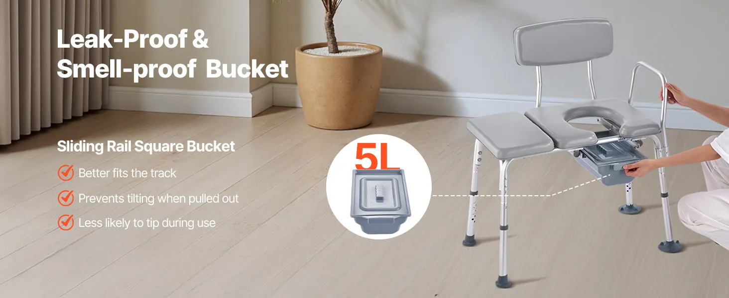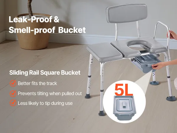 Emmer van 5 liter: De commode is voorzien van een uitneembare emmer van 5 liter met een uitschuifbaar railsysteem om kantelen en morsen te voorkomen. Het lekvrije deksel houdt nare geurtjes vast en zorgt voor hygiëne en veiligheid tijdens gebruik. Gemakkelijk schoon te maken en te onderhouden.