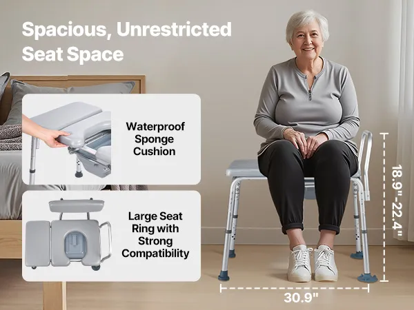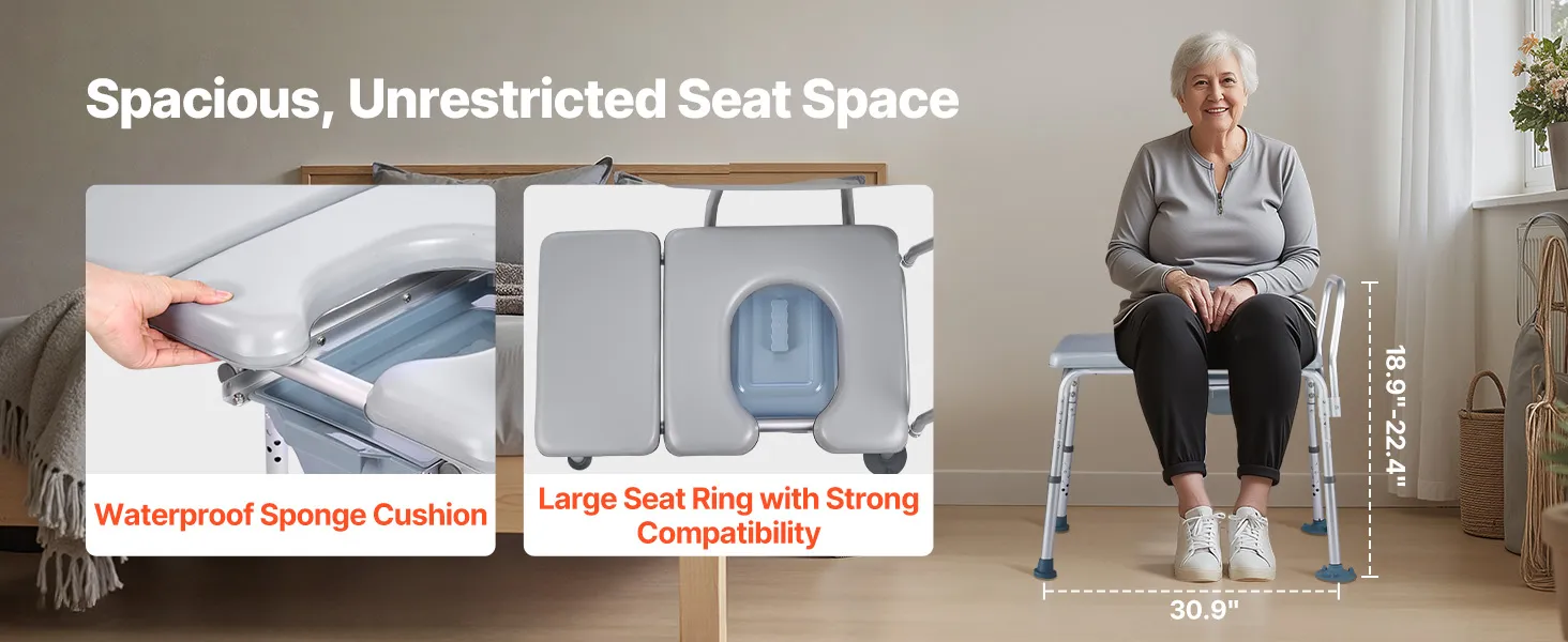 Ruim ontwerp: Het ontwerp met één arm zorgt voor extra zitbreedte, waardoor u minder hoeft te bewegen. Onze draagbare toiletstoel heeft een zachte zitting van veerkrachtig schuim voor extra comfort. Het waterdichte leren oppervlak is gemakkelijk schoon te maken en vermindert de groei van microben.