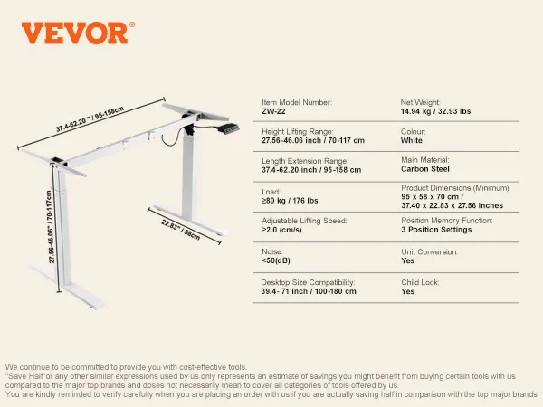 VEVOR Standing Desk Frame, Adjustable 70-117 cm Height & 95-158 cm Length Electric Stand Up Computer Desk Legs, Ergonomic DIY Workstation Base for Home and Office (White Frame Only)