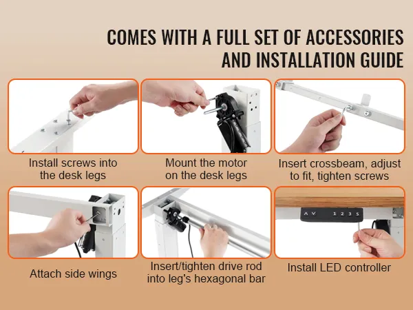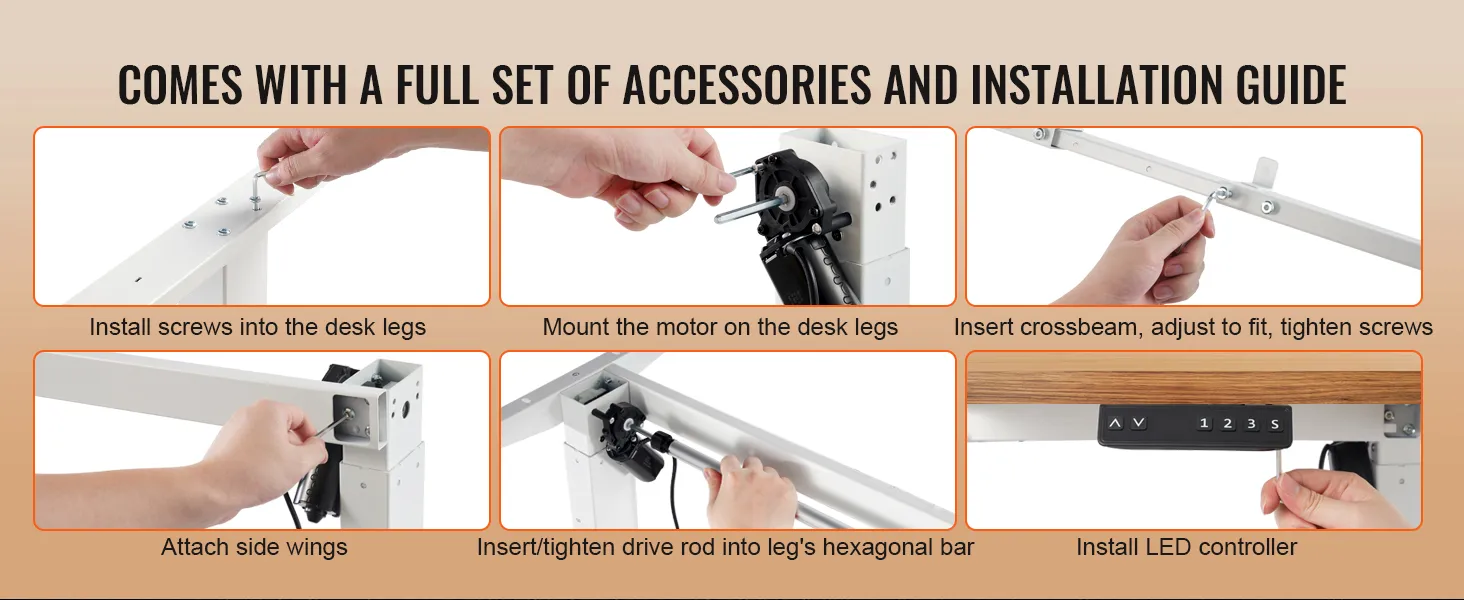 This standing desk comes with a complete set of accessories and a clear, easy-to-follow installation guide. When dealing with uneven surfaces, the footpads can be adjusted to ensure balance.