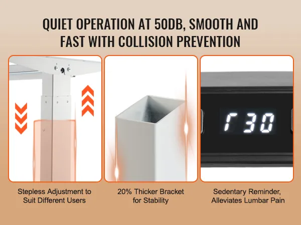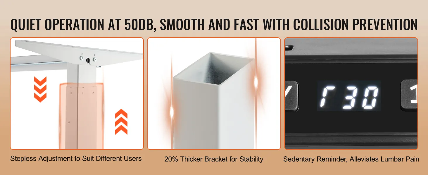 Featuring noise levels below 50 decibels during height adjustment, this desk operates smoothly and rapidly, with anti-collision design for added security. Its stepless height adjustment caters to various user needs, while the reinforced bottom bars ensure stability and prevent shaking.