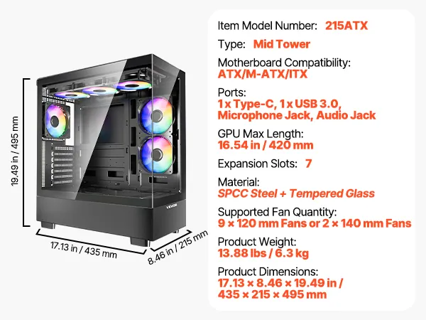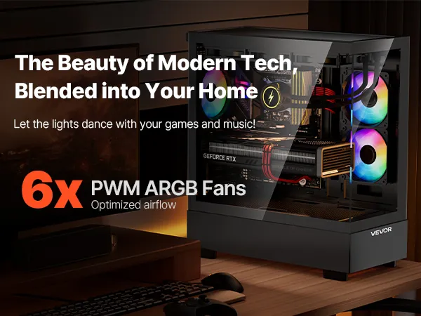 VEVOR PC Gaming-behuizing, mid-tower, gehard glazen paneel met hoge luchtstroom, stoffilter, 6x 120 mm PWM ARGB-ventilatoren, kabelbeheer, voor GPU tot 410 mm lengte, voor ATX/M-ATX/ITX