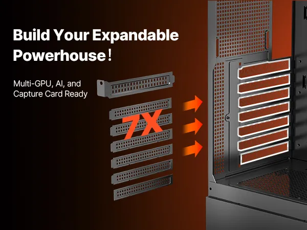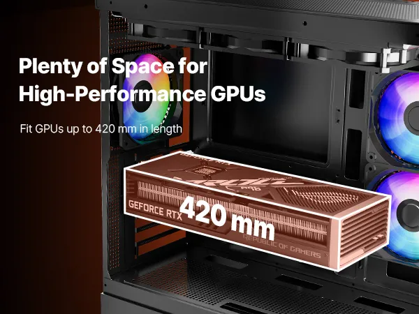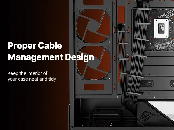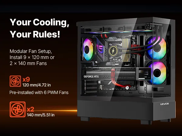 Verticale luchtstroomkoeling: de behuizing van de gamingcomputer ondersteunt maximaal 9 x 120 mm (4,72 inch) ventilatoren of 2 x 140 mm (5,51 inch) + 6 x 120 mm (4,72 inch) ventilatoren, wat zorgt voor een uitzonderlijke koelefficiëntie. Houd je systeem op optimale temperatuur tijdens intensieve gamesessies en voorkom oververhitting.