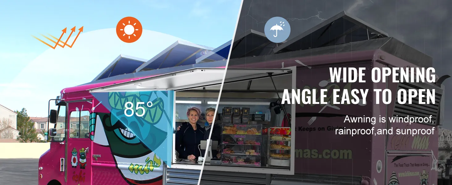Gemakkelijk te openen: Met een grote openingshoek van 85° voor een ruim zicht, voorzien van twee hydraulische stangen, gaat het serveerraam moeiteloos open. Met dit afhaalloket kunt u eenvoudig eten aan klanten serveren. De meegeleverde zonwering beschermt tegen regen, zonlicht en diefstal.