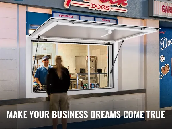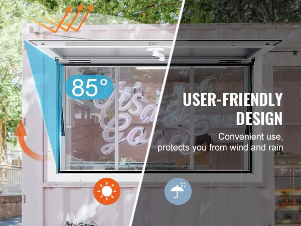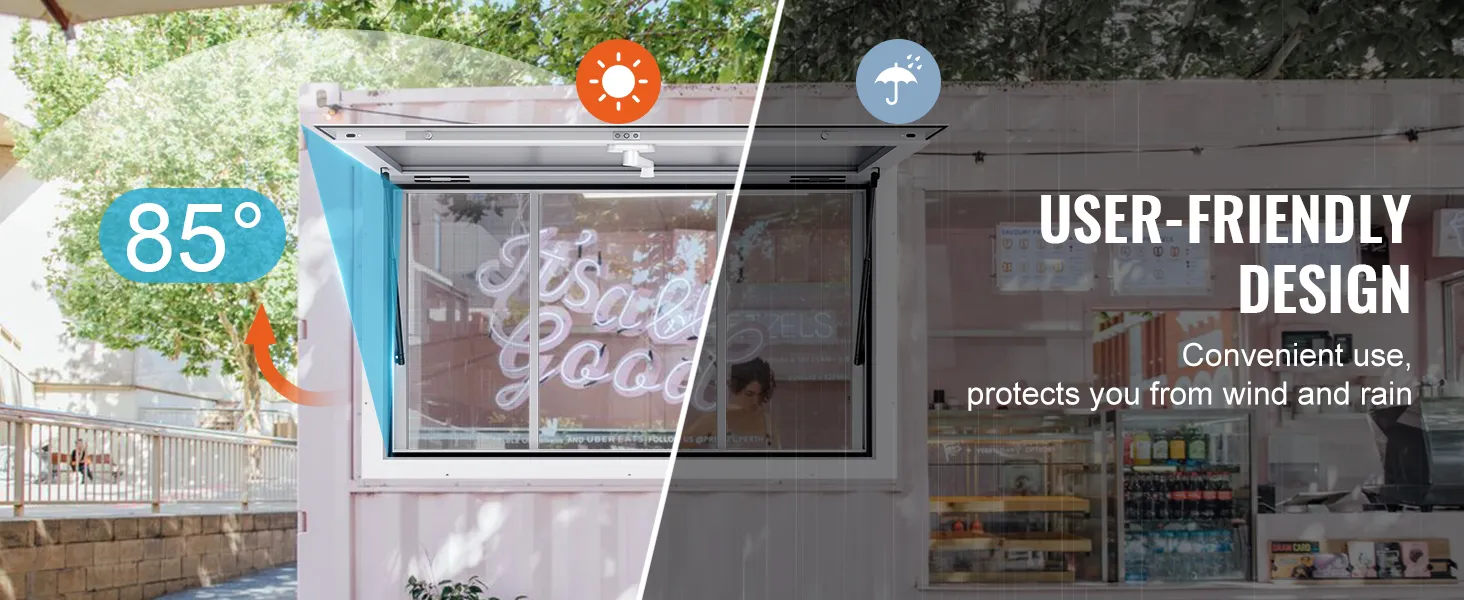 Gemakkelijk te openen: Met een openingshoek van 85° en twee hydraulische stangen kan het snackraam moeiteloos worden geopend. Met dit snackraam kunt u uw klanten gemakkelijk eten serveren. Het meegeleverde zonnevizier beschermt tegen regen, zonlicht en diefstal.