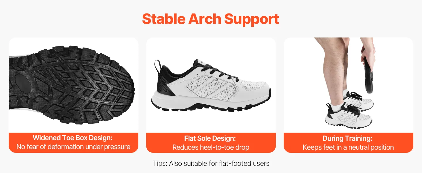 All-Around Support Sole: The MD rubber outsole of the training shoes features anti-slip patterns for strong grip, with a flat, neutral design. A widened forefoot enhances power, while stable arch support makes it ideal for flat feet, providing solid support with every step for a more secure workout.