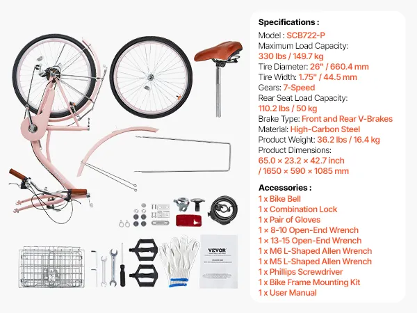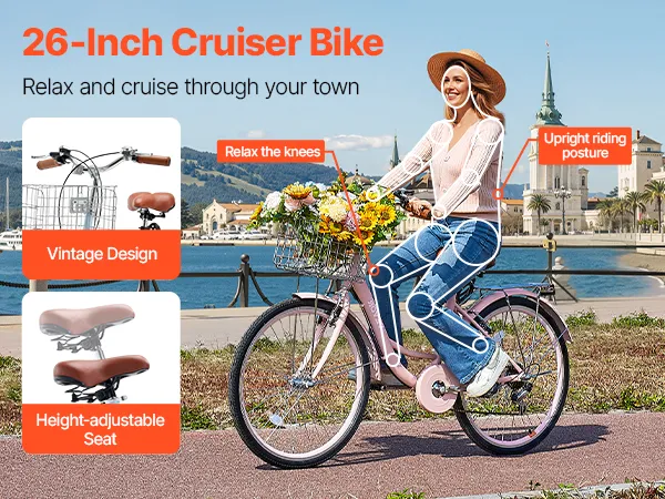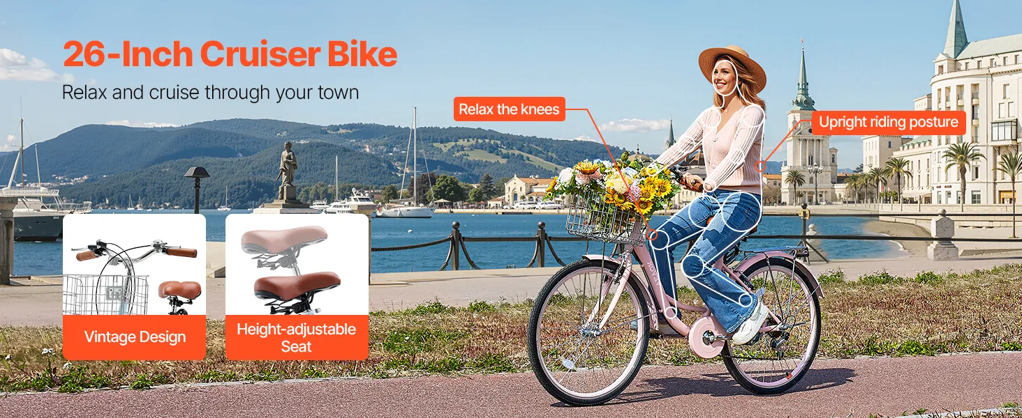 VEVOR Cruiser Bike, 7-Speed, 26-Inch Pink Beach Cruiser Bike with Large Capacity Basket and Rear Rack, Secure & Sturdy Cruiser Bike with Adjustable Seat, Fits for Cycling, Exercise & Shopping
