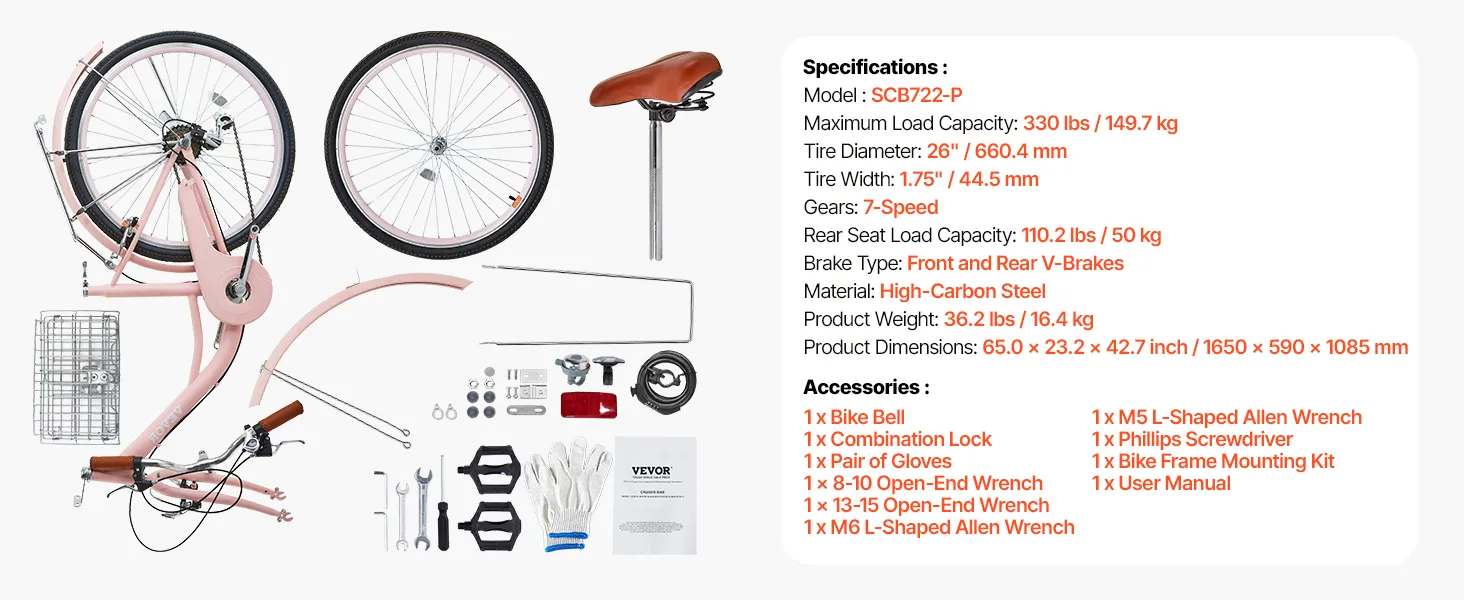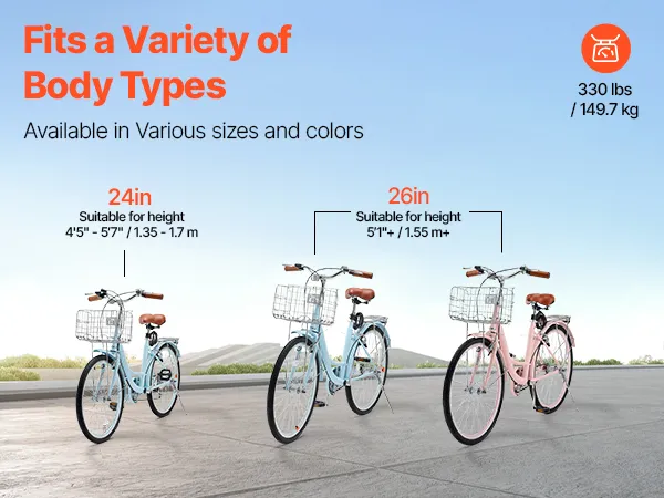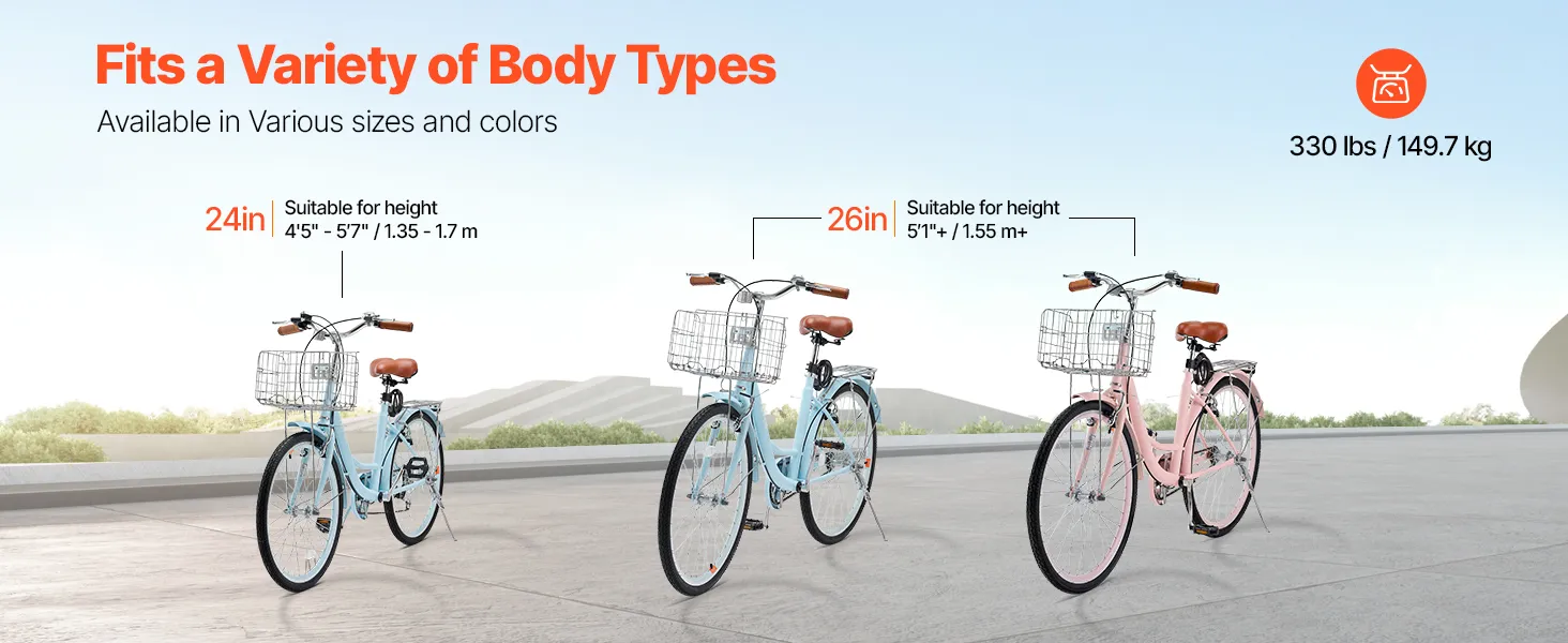 Multiple Size Options: Available in different sizes and colors to suit various riders. The sturdy frame supports up to 330 lbs / 149.7 kg. Riders from 4'5" to 5'7" are best suited for 24" wheels, while those 5'1"+ should opt for 26" wheels. Comes with complete installation accessories for a wonderful setup.