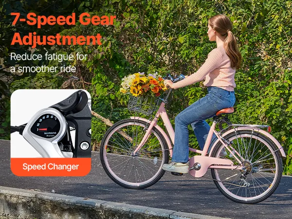 This cruiser bike is equipped with a 7-speed gear system, allowing you to shift effortlessly between speeds. Whether navigating city streets, small-town roads, or tackling gentle slopes, the smooth gear transitions provide a comfortable and efficient ride.