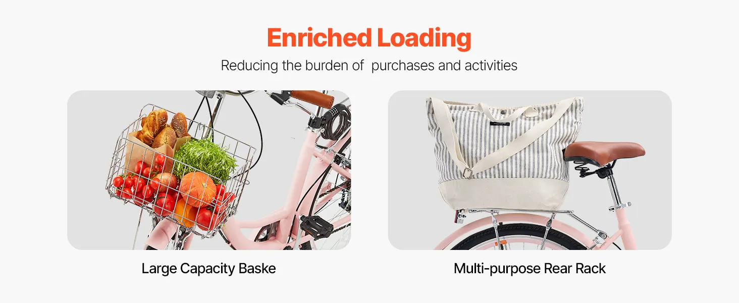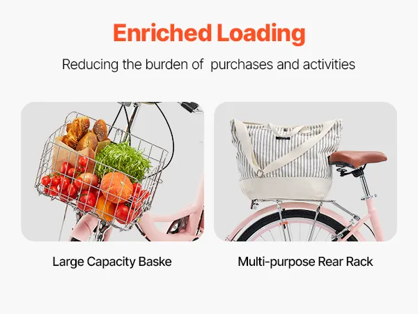 This cruiser bike features a spacious front basket and a sturdy rear rack, making it ideal for carrying groceries, bags, or other essentials. Whether running errands or enjoying a leisurely ride, it offers the convenience you need for everyday use.