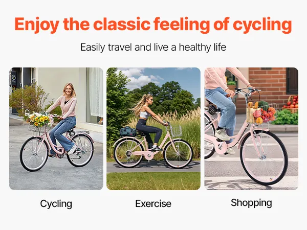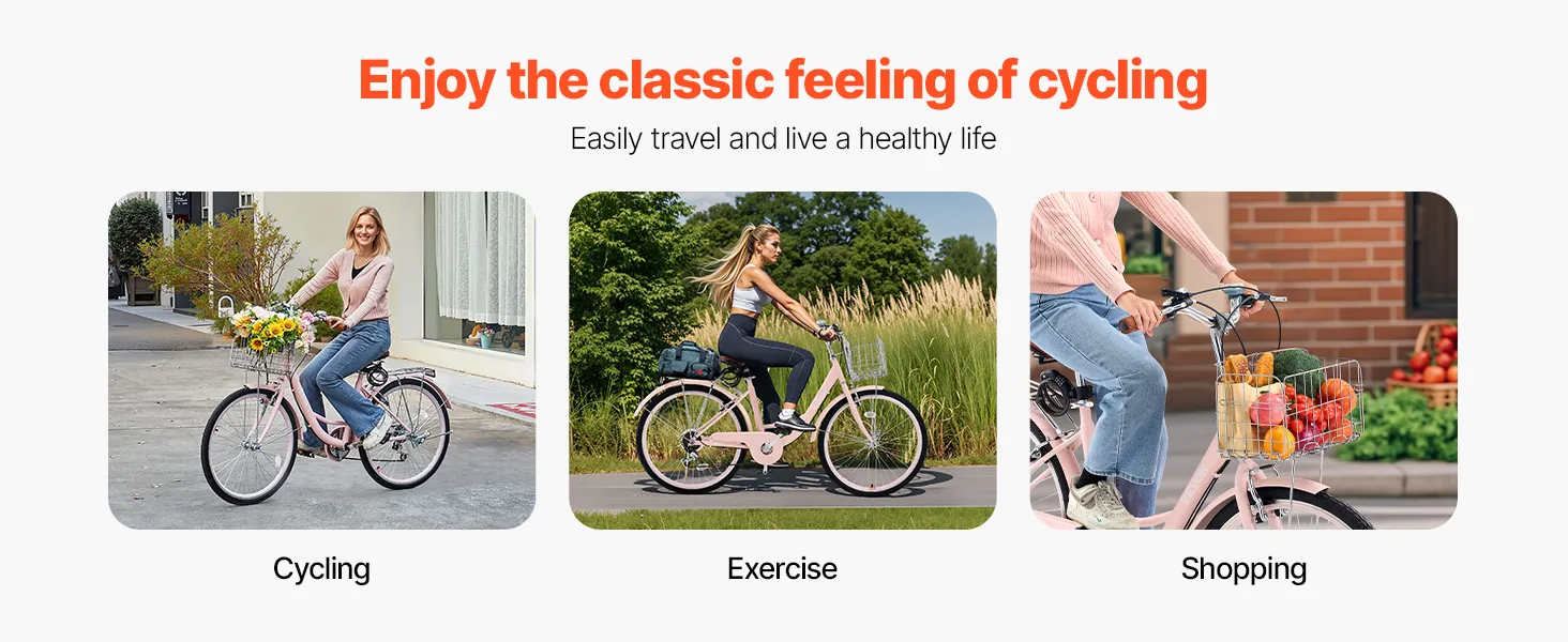 Stylish & Comfortable: This cruiser bike features a wide, soft adjustable seat and ergonomic handlebars for ultimate comfort. Its upright riding style allows effortless use, whether wearing a dress or jeans, and adapts well to various terrains. Ideal for casual cruising, beach rides, city sightseeing, and short commutes.