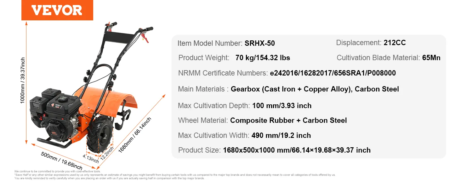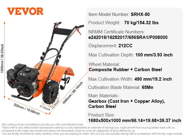 Krachtige 212cc 4-takt: Met een cilinderinhoud van 212cc biedt deze freescultivator uitstekende prestaties voor het werken in moestuinen, bloembedden of moestuinen. Het is NRMM gecertificeerd voor een milieuvriendelijke en efficiënte teelt.