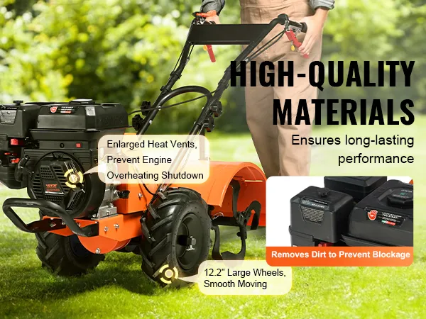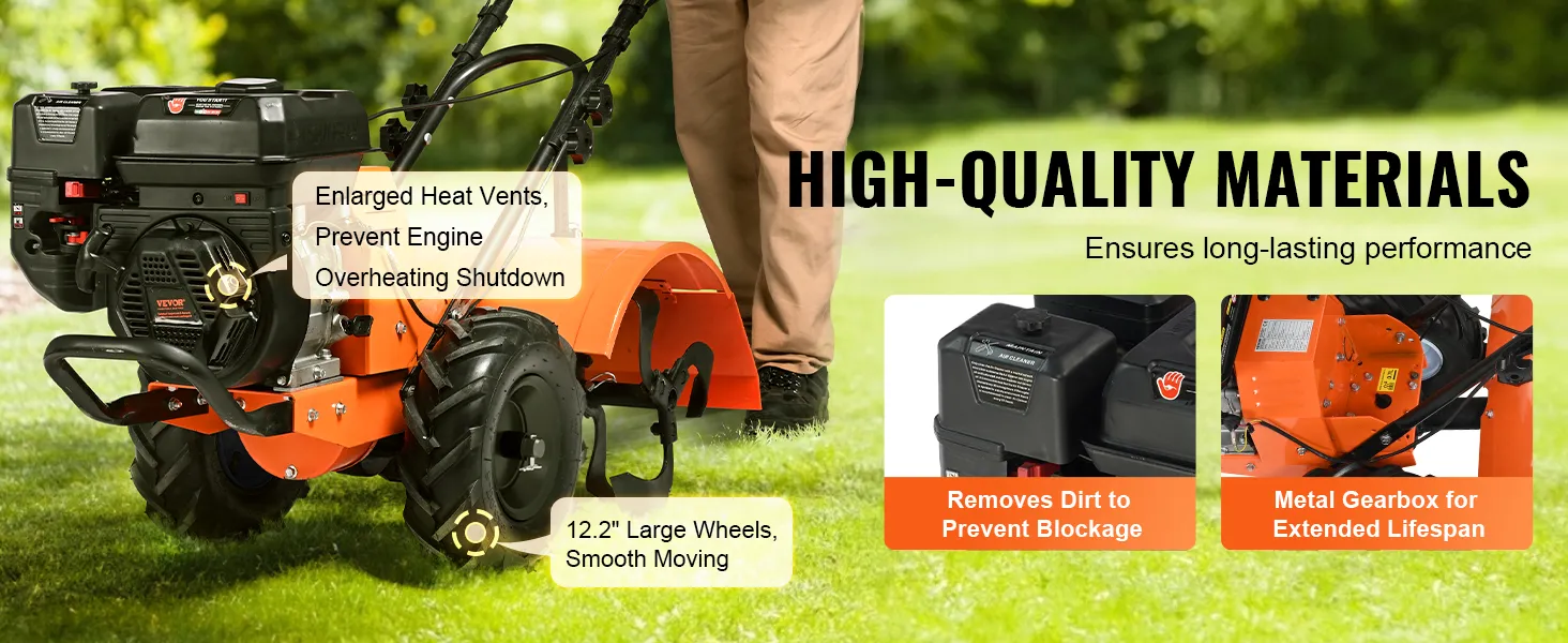Efficiënte grondbewerking: Vier 13,8-inch 65Mn stalen tanden met bidirectioneel ontwerp bewerken harde grond snel en zorgen voor topprestaties op elk terrein. Op het handvat gemonteerde schakelaars en remmen zorgen voor een betere controle. Een beschermschild over de tanden voorkomt dat grond, stenen of vuil opspatten.