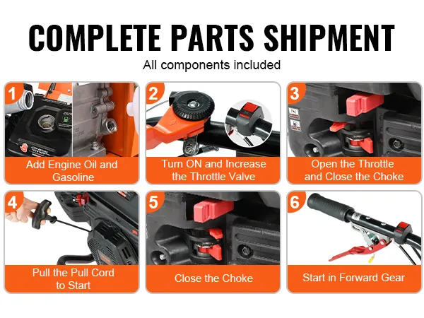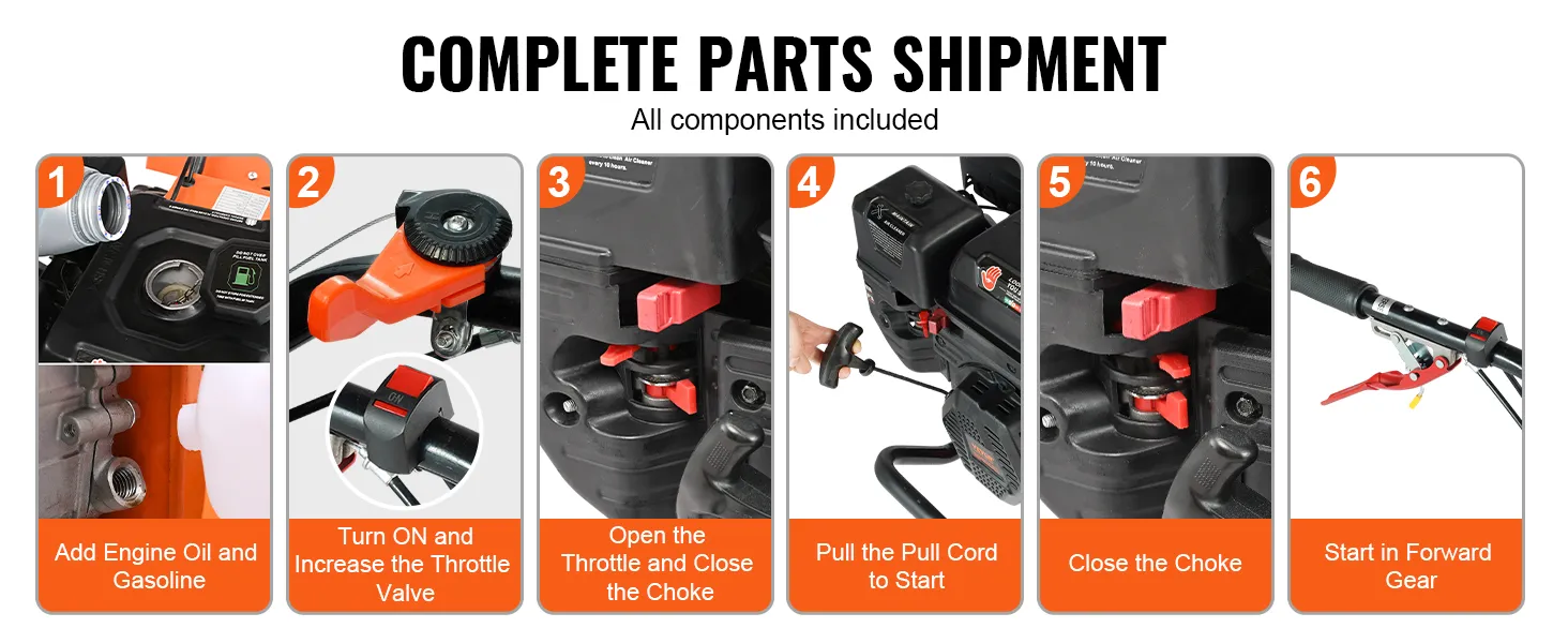 Wij zorgen ervoor dat elk onderdeel intact en zonder omissies aankomt. Met slechts drie eenvoudige stappen kunt u de gasaangedreven tuinfrees eenvoudig in elkaar zetten, waardoor u kostbare tijd en moeite bespaart bij het beginnen met tuinieren.