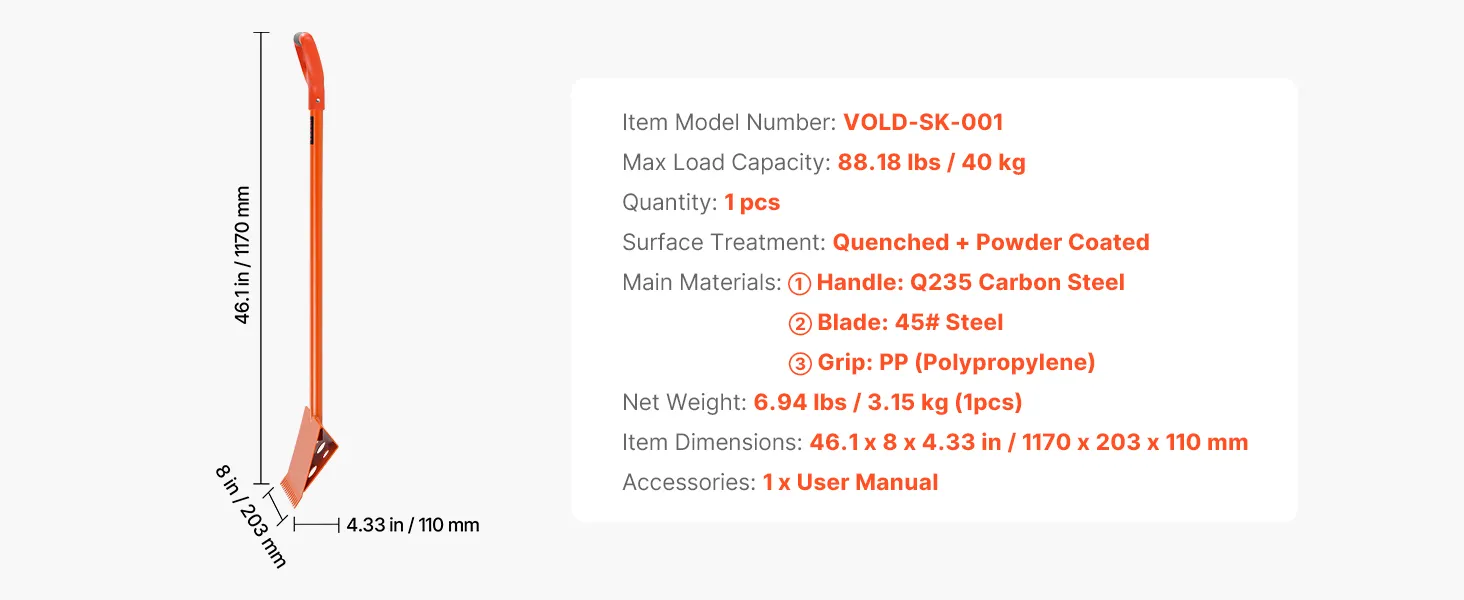 Ergonomisch, moeitebesparend ontwerp: de dakspanenschep heeft een zachte PP-handgreep voor een stevige grip en een schokabsorberende, ergonomische hendel van 78 cm lang. Dit vermindert de inspanning en zorgt voor comfort bij langdurig gebruik, waardoor handvermoeidheid tot een minimum wordt beperkt.