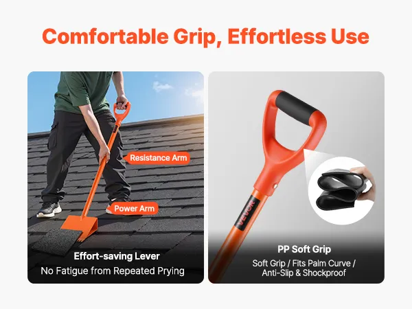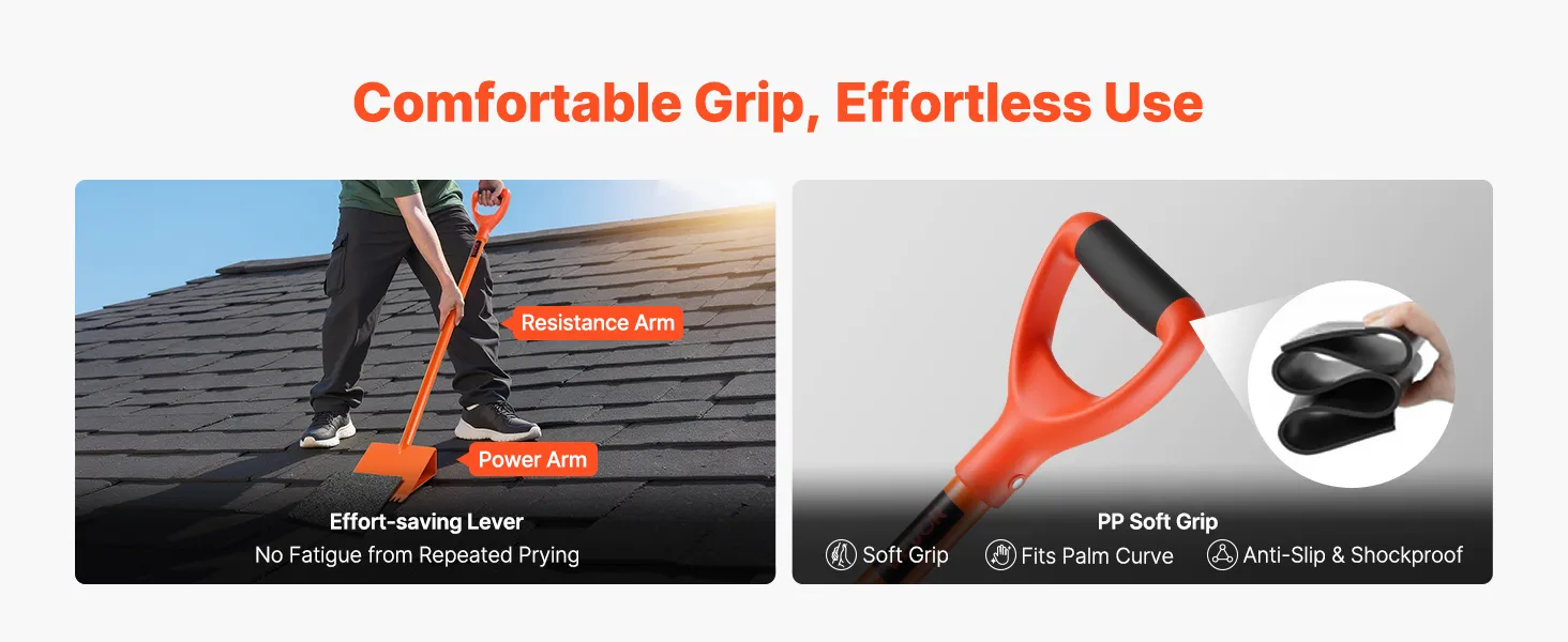 Deze dakschep maakt gebruik van het hefboomprincipe en optimaliseert de lengte van de weerstands- en krachtarmen voor moeiteloos werken. De zacht gecoate PP-handgreep zorgt voor een veilige, slipvaste grip en vermindert trillingen, wat zorgt voor comfort tijdens lange werksessies.