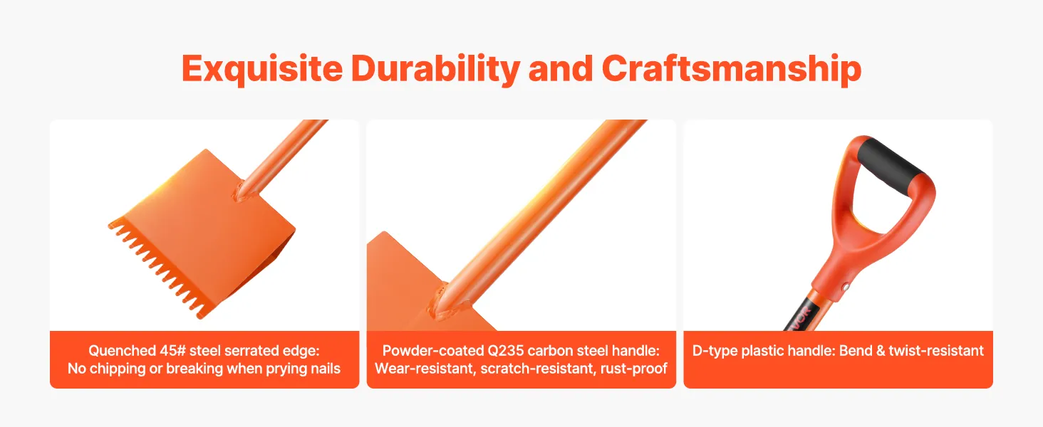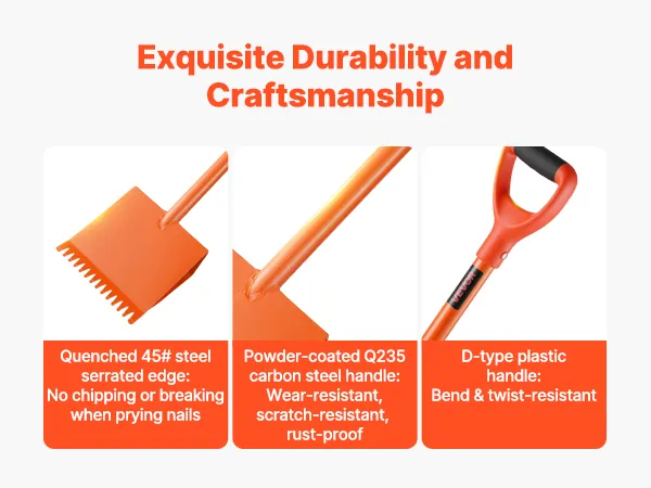 Het lemmet is gemaakt van warmtebehandeld 45# staal, wat afbrokkelen bij het breken van nagels voorkomt. De stalen handgreep is gespoten voor robuust gebruik, terwijl de kunststof D-greep extra stabiliteit biedt tegen buigen en draaien, wat betrouwbaarheid garandeert bij veeleisende taken.