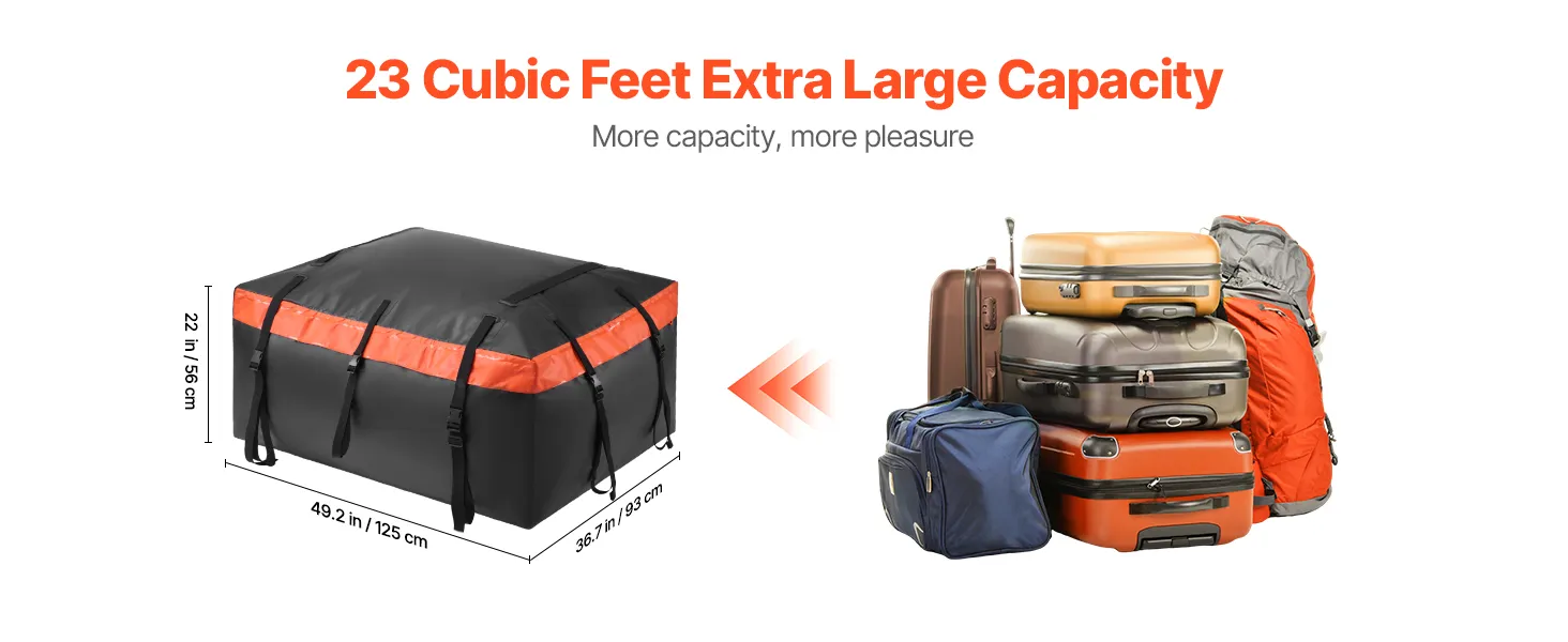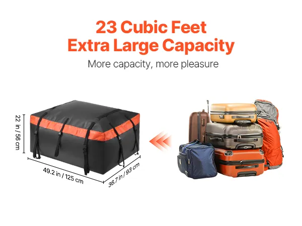 Large Capacity: Measuring 49.2" x 36.7" x 22", this 23 cubic feet roof cargo carrier offers ample room for sleeping bags, luggage, tents, and more. It's the perfect storage solution for road trips, camping, or family vacations, ensuring a more comfortable and enjoyable journey.