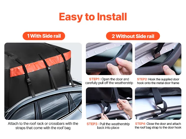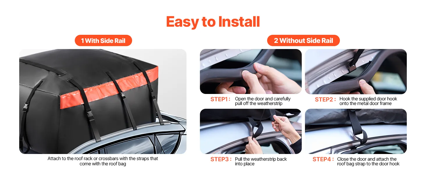 Easy to Install - Whether your vehicle has a roof rack or not, this car roof luggage carrier can be securely attached using straps or the included door hooks, ensuring a quick and hassle-free setup.